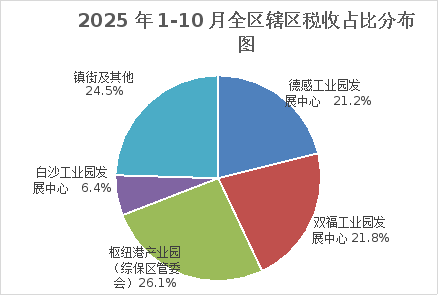 ——工业园辖区税收完成情况。按税务口径统计,1-10月,江津工业园总计入库56.7亿元,其中双福工业园发展中心入库16.4亿元,区级留存8.2亿元,同比入库增长2.5%、区级留存下降3.2%;德感工业园发展中心入库15.9亿元,区级留存8.1亿元,同比分别增长43.9%、52.7%(主要增收原因包括圣泉街道自今年7月起归入德感园区计算收入、西部水资源开发有限公司临时占用耕地缴纳耕地占用税0.93亿元);枢纽港产业园(综保区管委会)入库19.6亿元,区级留存9.6亿元,同比分别增长3.6%、7.4%;白沙工业园发展中心入库4.8亿元,区级留存1.5亿元,同比分别下降3.6%、13.3%。