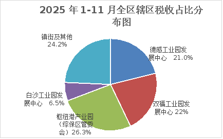 ——工业园辖区税收完成情况。按税务口径统计,1-11月,江津工业园总计入库61.3亿元,其中双福工业园发展中心入库17.76亿元,区级留存8.95亿元,同比入库增长2.2%、区级留存下降3.5%;德感工业园发展中心入库17亿元,区级留存8.71亿元,同比分别增长45.3%、55.1%(主要增收原因包括圣泉街道自今年7月起归入德感园区计算收入、西部水资源开发有限公司临时占用耕地缴纳耕地占用税0.93亿元);枢纽港产业园(综保区管委会)入库21.24亿元,区级留存10.37亿元,同比分别增长1%、5.6%;白沙工业园发展中心入库5.3亿元,区级留存1.72亿元,同比分别下降8.1%、13.4%。