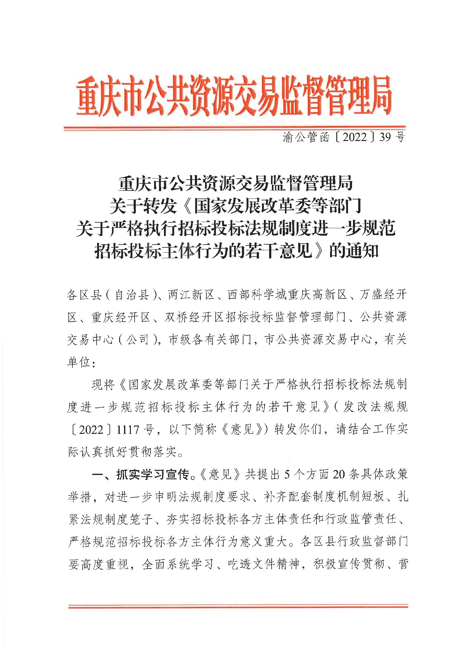 按照重庆市公共资源交易监督管理局《关于转发<国家发展改革委等部门关于严格执行招标投标法规制度进一步规范招标投标主体行为的若干意见>的通知》(渝公管函〔2022〕39号)精神,现将《国家发展改革委等部门关于严格执行招标投标法规制度进一步规范招标投标主体行为的若干意见》(发改法规规〔2022〕1117号,以下简称《意见》)转发给你们,请结合工作实际抓好贯彻落实。