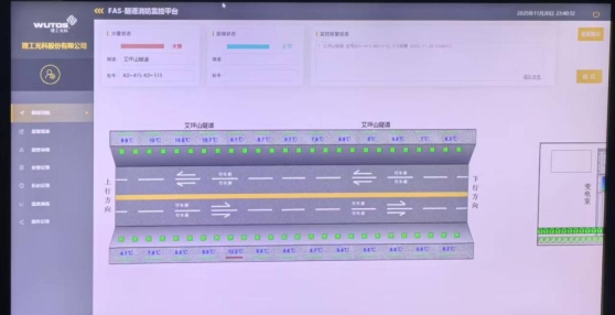 此次测试是隧道安全隐患整治后的一次关键核验。测试现场,系统不仅快速响应火情,更精准显示温感、烟感报警的具体桩号及实时温度,视频监控同步传回现场画面,全面验证了隧道火灾报警系统的灵敏度与可靠性。