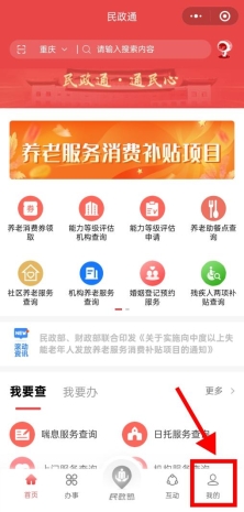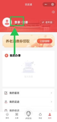 微信搜索【民政通】小程序或下载【民政通】APP。进入【民政通】小程序或APP,点击下方【我的】,再点击上方【注册】,进行注册。注册人可以是老年人或者代办人(家属、社区工作人员、机构工作人员等均可代办)。