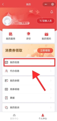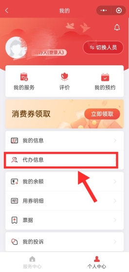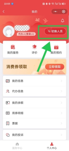 在“我的页面”点击“切换人员”,选择您要为其代办服务的老年人。注:如果老年人用自己的身份信息注册并登录,为自己领取消费券,此步不需要操作。