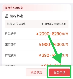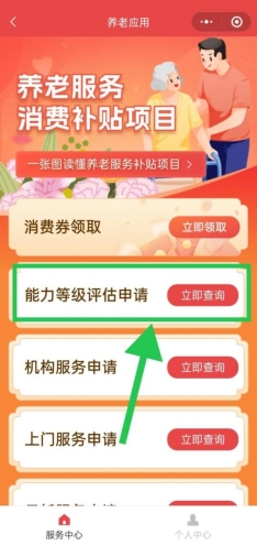 点击【能力等级评估申请】,根据地区选择评估机构,进入后点击【服务申请】,选择日期、时间后提交。注:已进行长护险评估且正在享受长护险的老年人,可不再申请能力评估,待全市长护险失能等级数据上传“民政通”平台后,可以直接申领消费券。