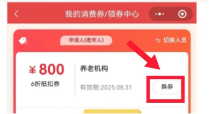 注:每个老年人每月只可领取/享受一种消费券,请注意选择适合的消费券,可以点击【换券】更换消费券类别。