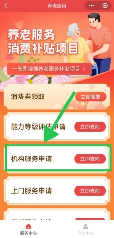 领取成功后,在【养老服务消费券补贴项目】专栏,选择自己需要的服务,点击【立即查询】,在查询结果页面中选择一个服务机构,进入该机构页面后点击【服务申请】,填写服务内容、服务时间,点击【提交】,等待服务机构审核。在【我的】页面,点击【我的预约】,可查询到自己提交的预约记录。