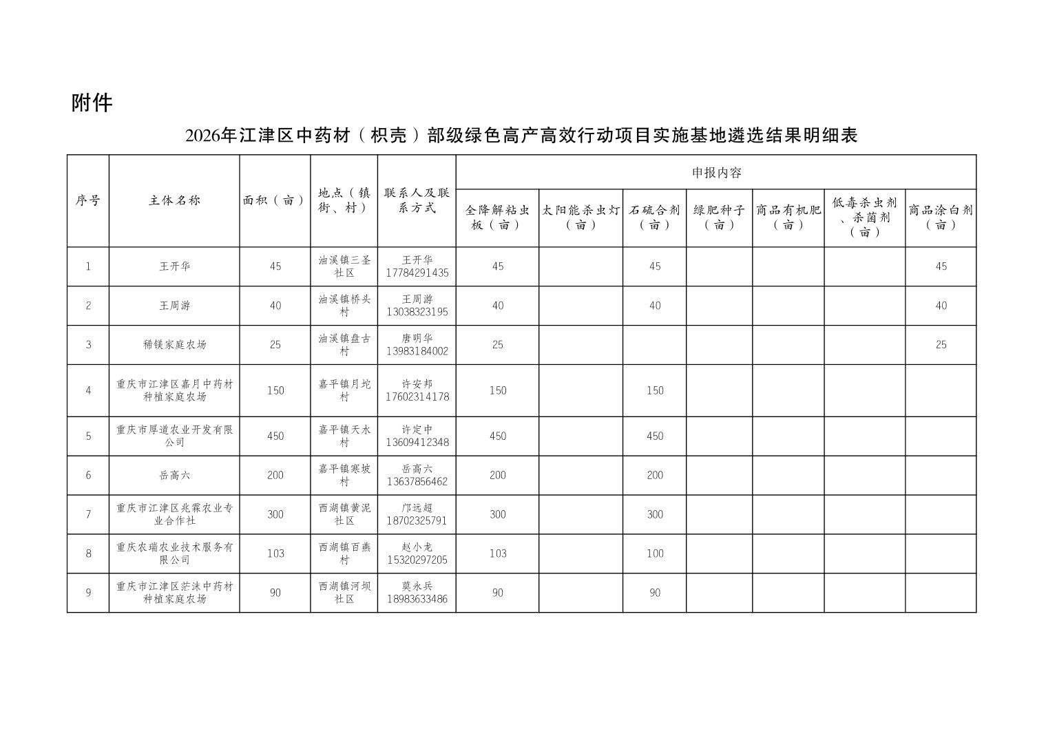 附件:2026年江津区中药材(枳壳)部级绿色高产高效行动项目实施基地遴选结果明细表