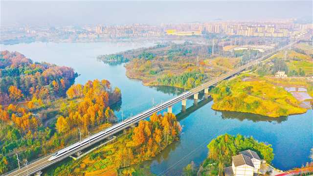 12月21日,梁平区双桂街道安宁村,一列郑(州)万(州)高速列车从水杉树林旁飞驰而过,与梁平区双桂湖国家湿地公园和国际湿地城市梁平区双桂新城相映成景。