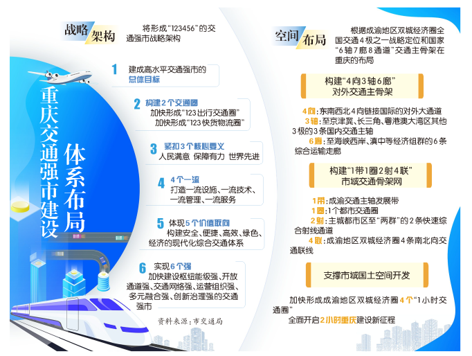到2027年,国际性综合交通枢纽城市能级大幅跃升,多式联运枢纽组合效益充分彰显,重庆对西部地区辐射带动集聚效应显著增强。现代化综合立体交通网基本建成,基本实现成渝地区双城经济圈和渝西地区4个1小时交通圈、市域2小时畅行、3小时周边省会城市畅达、6小时北上广通达。到2035年,交通强市基本建成,在现代化新重庆建设中交通“贡献度”大幅提升,成为新时代新征程新重庆建设的开路先锋。