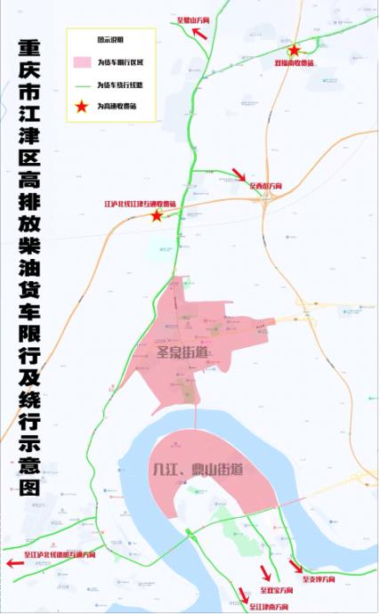 一、从2025年12月29日起,全天24小时禁止国三及以下排放标准的柴油货车驶入江津区几江、鼎山、圣泉街道城区以内区域。