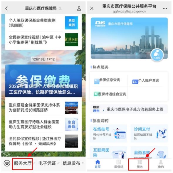 1.关注“重庆市医疗保障局“微信公众号,注册登录,点击【服务大厅】,点击底部的【服务】;