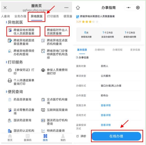 (一)线上办理。可登录“重庆市医疗保障局”微信公众号进入【服务大厅】,点击底部【服务】,在服务页面【异地就医】模块,根据需求选择【跨省异地长期居住人员就医备案】或【跨省临时外出人员就医备案】,进入【在线办理】页面办理。也可登录“渝快办”APP,点击【办事】,在【医疗保障】模块点击【更多】,根据需求选择【跨省异地长期居住人员就医备案】或【跨省临时外出人员就医备案】,进入【在线办理】页面办理。还可通过拨打备案电话办理(仅限临时外出就医备案,有效期为三个月)。