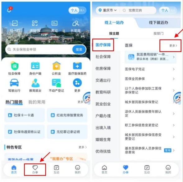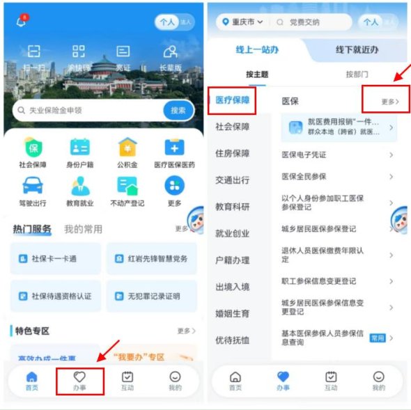 1.登录渝快办APP,点击【办事】,在【医疗保障】模块点击【更多】;