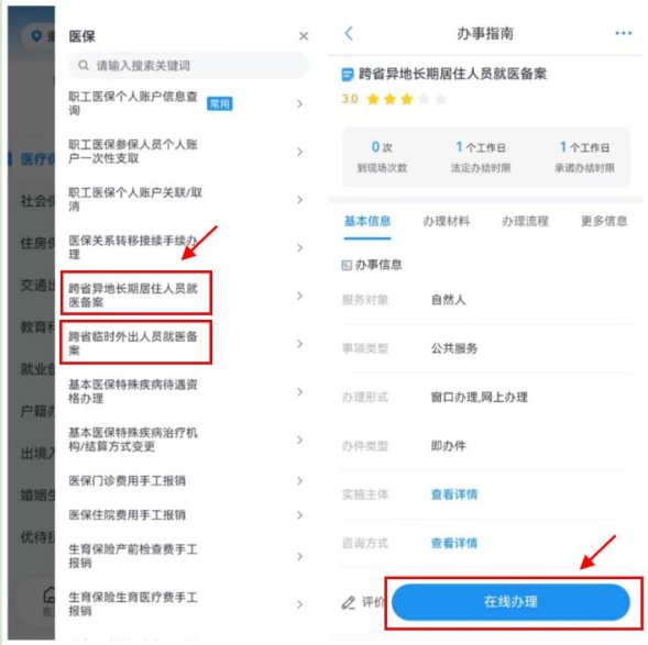 2.根据需求选择【跨省异地长期居住人员就医备案】或【跨省临时外出人员就医备案】,进入【在线办理】页面办理。