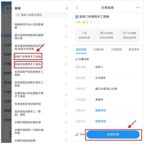 2.根据需求选择【医保门诊费用手工报销】或【医保住院费用手工报销】,点击【在线办理】进入页面办理。