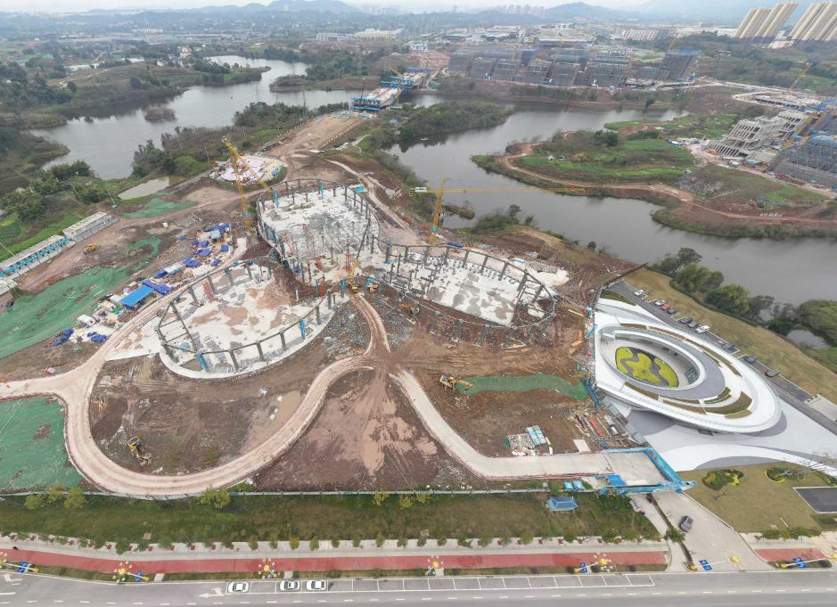 滨水会展中心作为江津区宜居城市建设项目,位于福城南干道与祥福大道的交汇处,用地面积约5.9万平方米,总建筑面积约2.5万平方米,主要功能包括会展用房、行政办公用房、会议用房、餐饮用房、后勤用房以及与之相配套的辅助用房等。截至目前,滨水会展中心首开区的智能建造管控中心已经提前完工,大区已完成车库区域主体结构和钢柱安装,网架安装约完成30%。