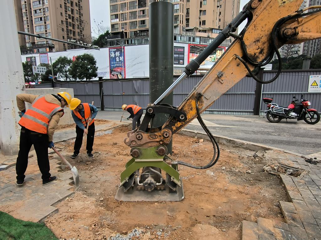 塔坪路人行天桥项目正在进行扩大基础基坑夯实作业