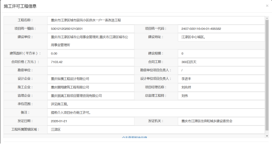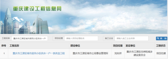 在“工程名称”处查询:重庆市江津区城市居民小区供水一户一表改造工程