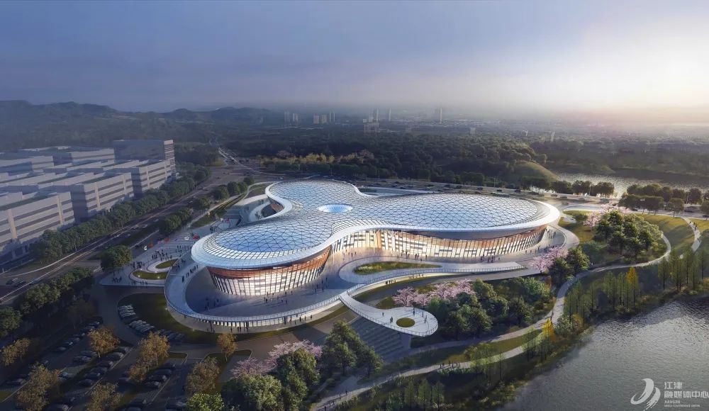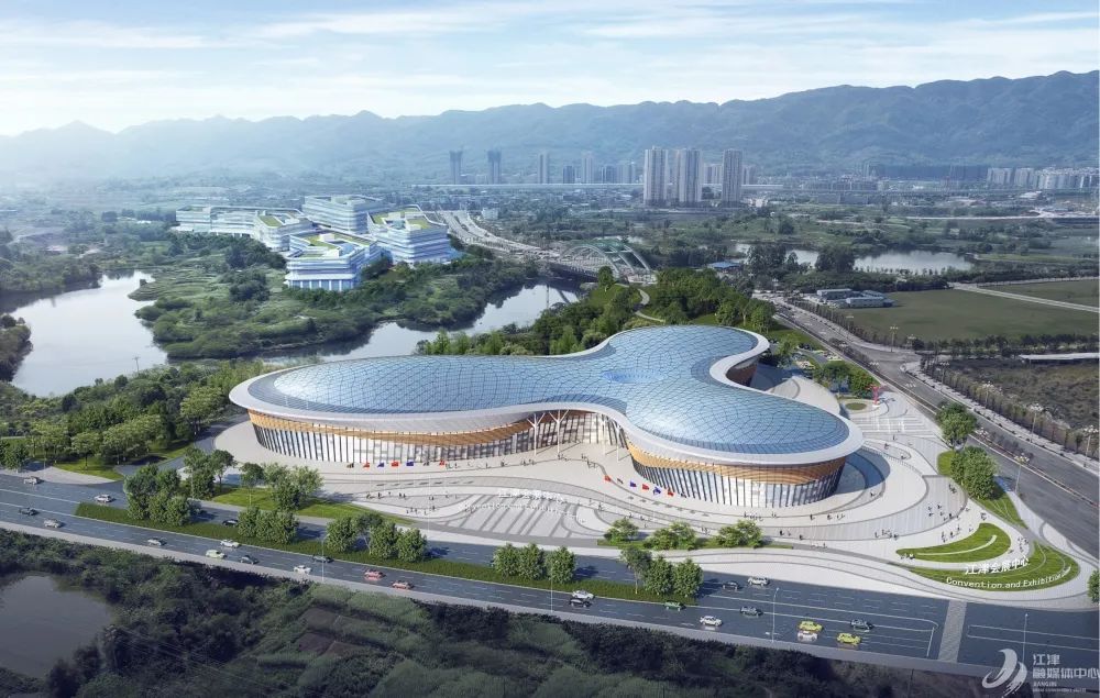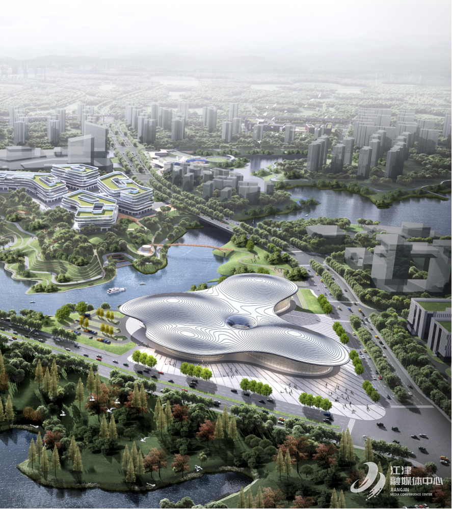 会展中心外观采用云朵概念,通过圆润、柔美的整体造型,打造以“智慧云”为设计理念的会展建筑;以此体现江津团结湖园区智能制造产业的科技性与未来性。建筑整体天际线变化丰富,流动感强烈。