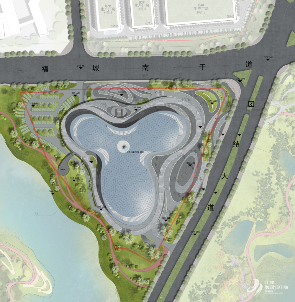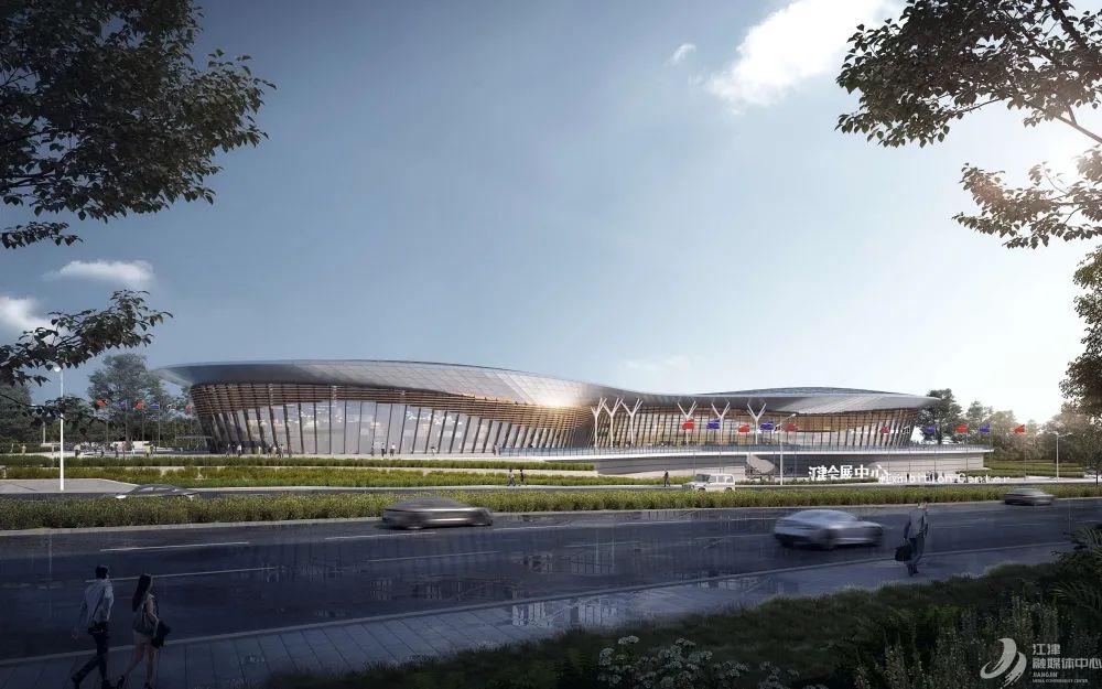 团结湖滨水会展中心项目位于江津区土堡片区,西南侧为团结湖水库,东南侧为祥福大道。建设用地面积为51273.44平方米,规划设计为一栋单体会展建筑。