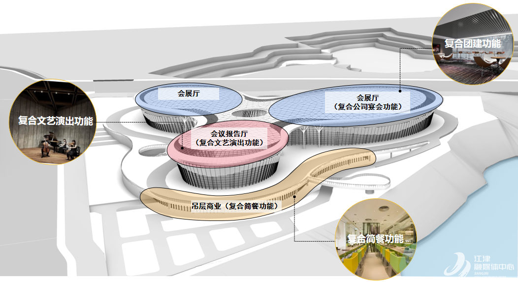 项目周围形成环道,保证车行流线贯通,满足运营期车流、货物运输。功能复合公司宴会、会展、会议三个功能板块,其中部分会展与团公司宴会功能可灵活转换,为未来项目运营打下基础。