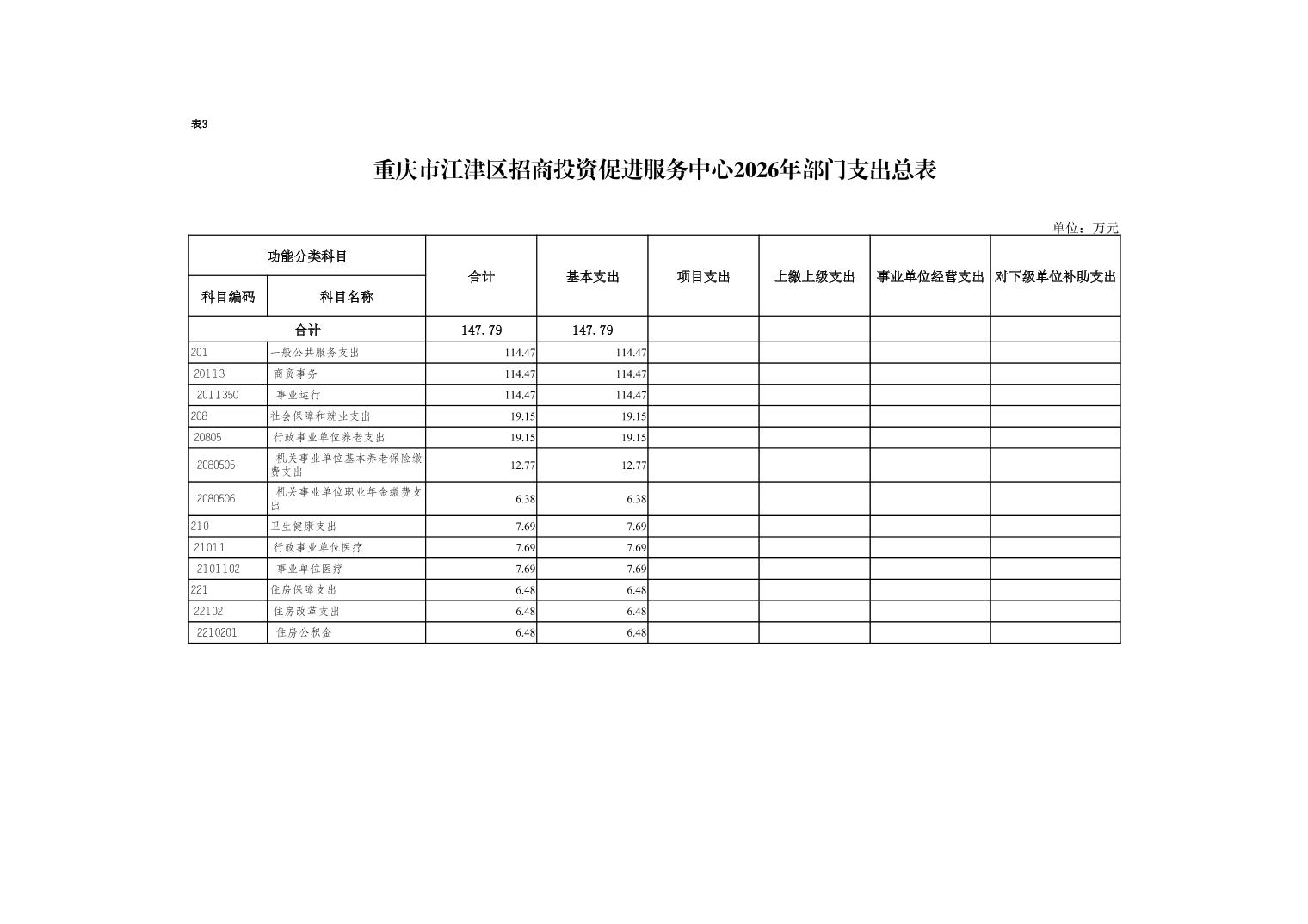 2026年年初预算数147.79元,其中:一般公共服务支出114.47万元,社会保障和就业支出19.15万元,卫生健康支出7.69万元,住房保障支出6.48万元。支出较去年增加147.79万元,主要是该单位为2025年新增正科级事业单位,年初无预算。