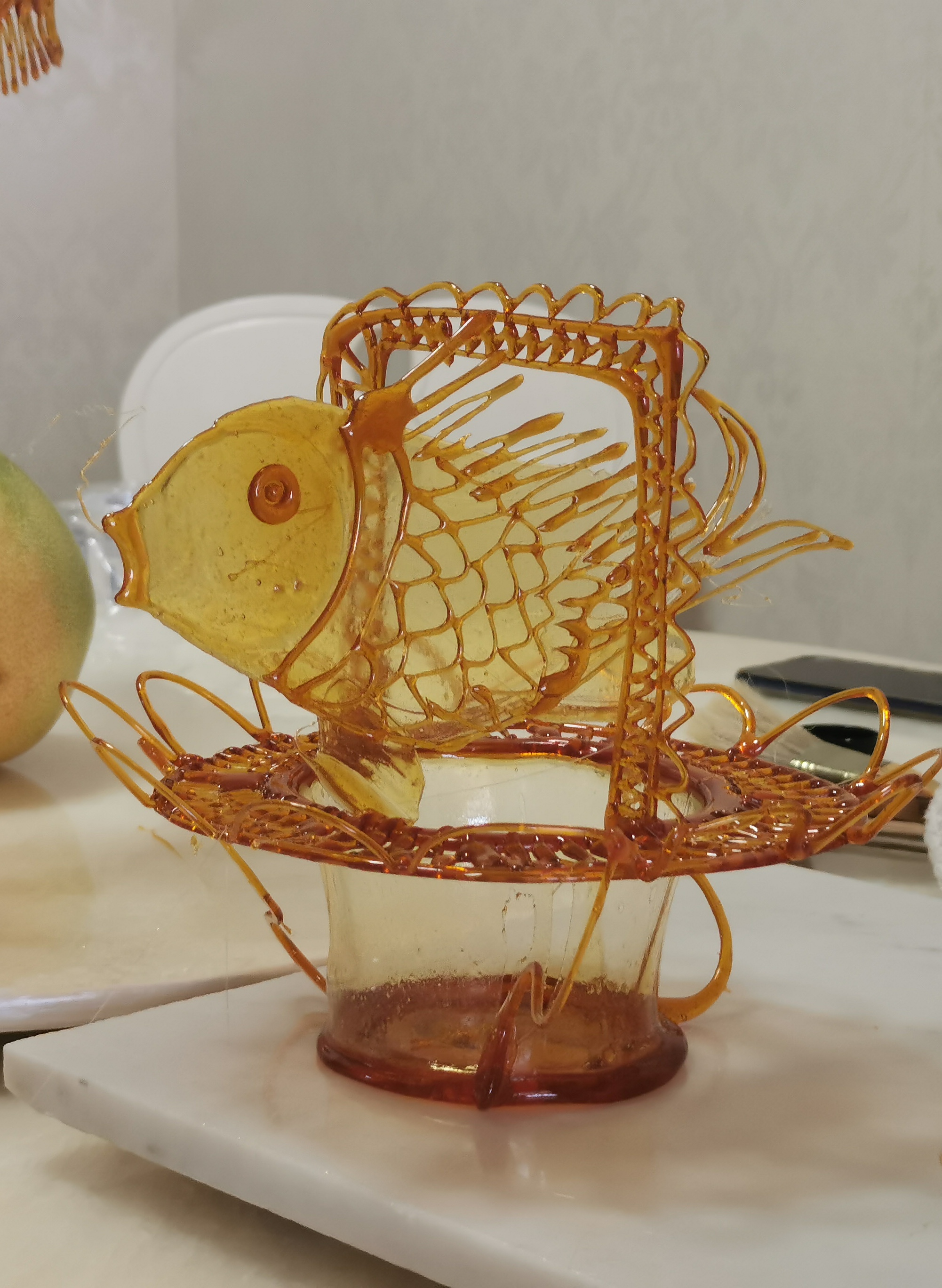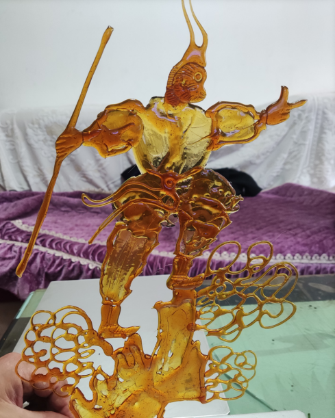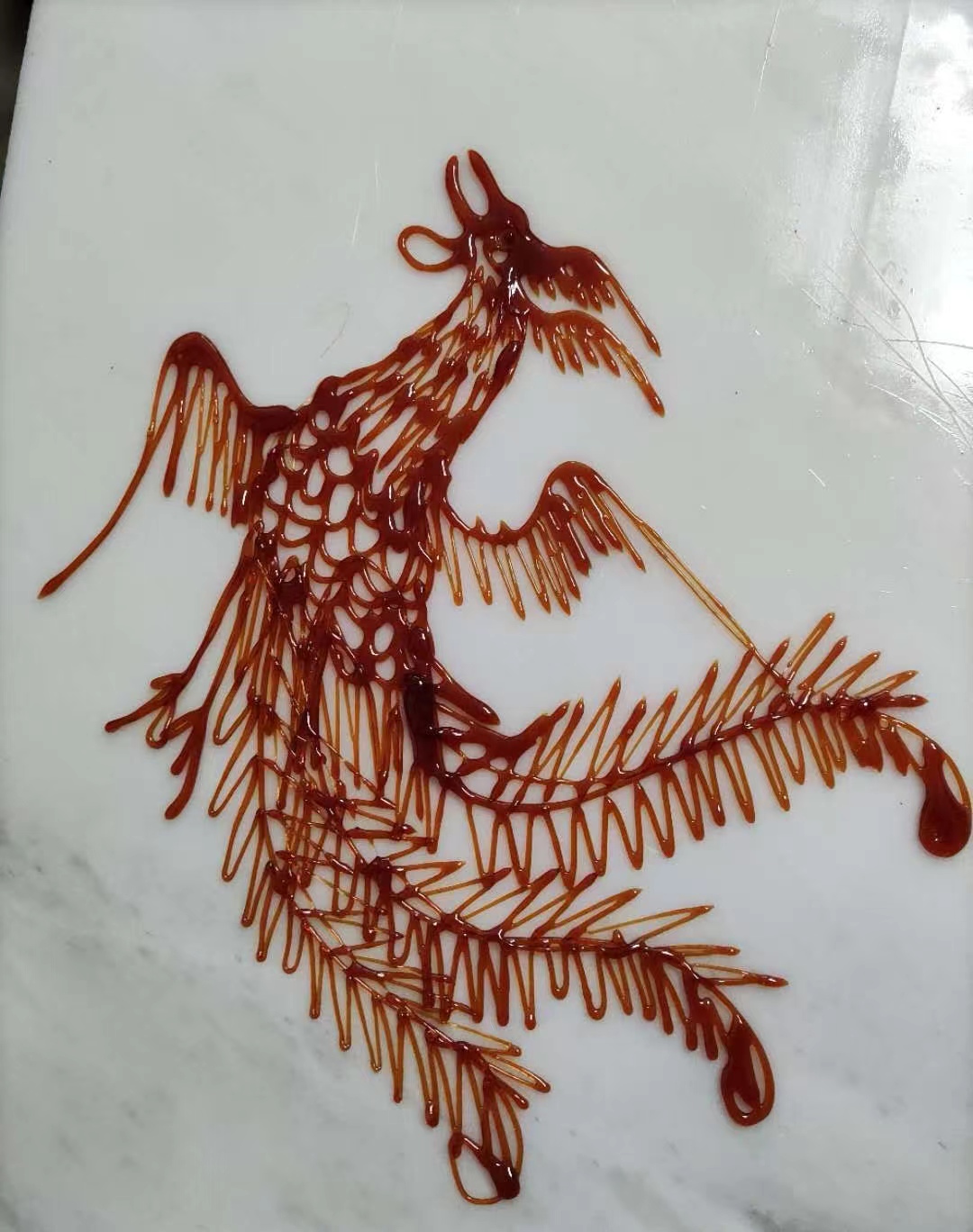 在绘制造型时,由艺人用小勺舀起溶化的糖浆,在石板上飞快地来回浇铸,民间艺人的手上功夫便是造型的关键。最常见的"糖画"是平面糖画。除了平面画,手艺好的艺人还会在石板上做出风格各异的立体糖画来,像极一件装饰品,令人不忍吃掉。