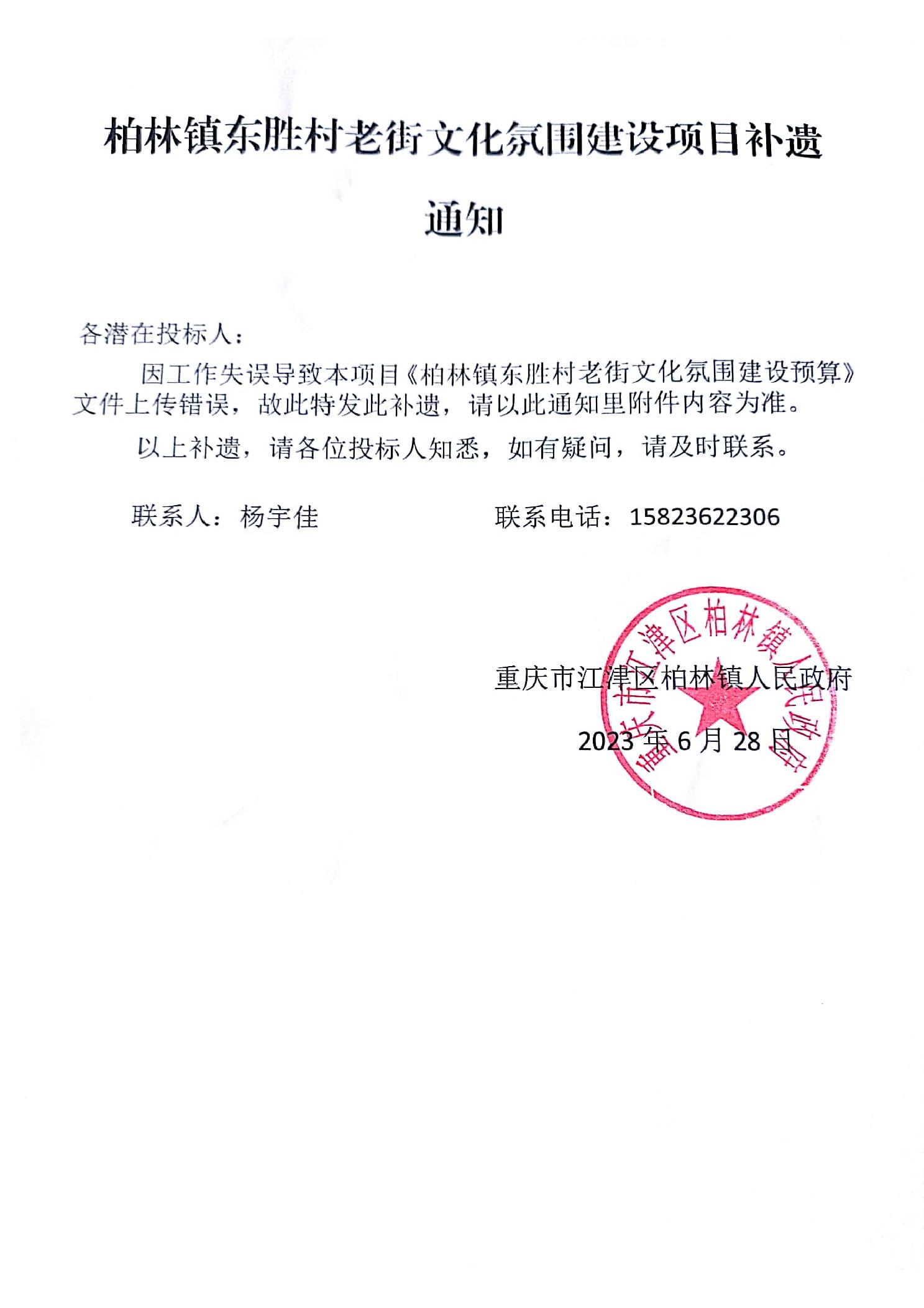 因工作失误导致本项目《柏林镇东胜村老街文化氛围建设预算》文件上传错误,故此特发此补遗,请以此通知里附件内容为准。