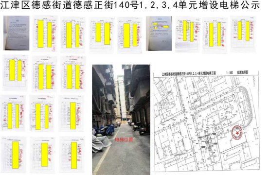 江津区德感街道德感正街140号1,2,3,4单元白世勤等41户业主申请增设电梯,项目位于德感街道德感正街140号1,2,3,4单元。现我街道依申请对拟增设电梯内容进行公示,公示时间为2026年3月25日-2026年4月1日。