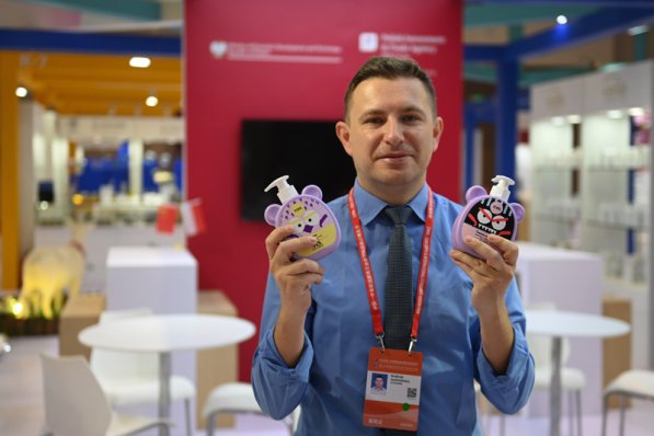 在第三届中国—中东欧国家博览会暨国际消费品博览会中东欧展馆,企业代表展示来自波兰的日用消费品(5月16日摄)。新华社记者 黄宗治 摄