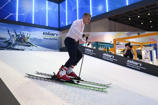 在第三届中国—中东欧国家博览会暨国际消费品博览会中东欧展馆,来自斯洛文尼亚的企业代表现场展示雪具产品(5月16日摄)。新华社记者 黄宗治 摄
