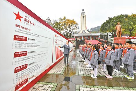 在聂荣臻元帅陈列馆铜像广场前,学生们在讲解员的带领下,参观了国家安全长廊。随后,学生们进入聂帅馆展厅,通过瞻仰珍贵图片、视频和历史实物,深刻领会聂荣臻元帅忧国忧民、殚精竭虑、艰苦奋斗、保守秘密的崇高精神,“没有强大的军事、尖端的科技,我们的国家安全何来维护”“国家秘密任何时候都不能透露”……聂帅一声声话语仿佛就在耳边,6名“红领巾讲解员”用生动的语言和鲜活的案例,向大家讲述了国家安全的重要性以及每个人在维护国家安全中的责任。