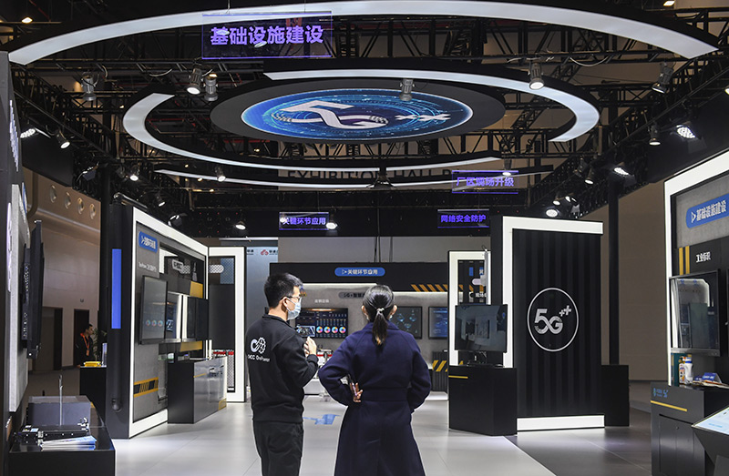 11月20日,参观者在“2022中国5G+工业互联网”成果展展厅参观。