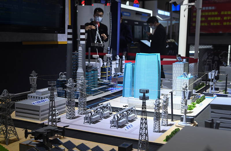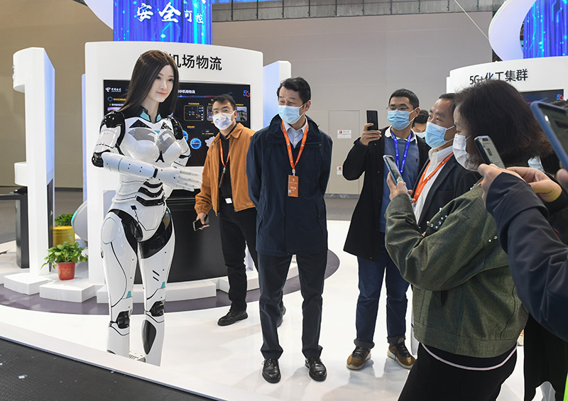 11月20日,工作人员向参观者介绍5G智能工厂生产场景。