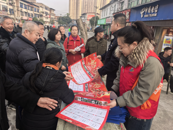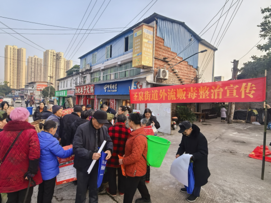 1月13日,正值圣泉街道土堡临时菜市场赶集时间,在场镇中央,有这样一群身影在行动。他们向过往群众发放宣传折页、禁毒年画、禁毒围裙、禁毒布袋等物品;从群众生活的各个方面宣传毒品对个人、对家庭、对社会的严重危害,这群身影就是由圣泉街道平安综治岗禁毒社工、派出所民警、土堡社区工作人员组成的禁毒志愿小分队。
