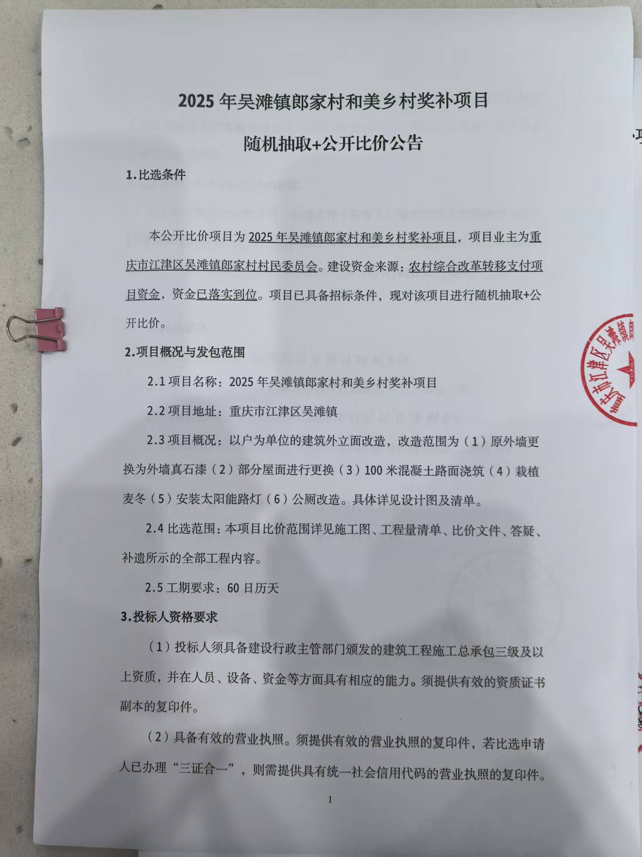 本公开比价项目为2025年吴滩镇郎家村和美乡村奖补项目,项目业主为重庆市江津区吴滩镇郎家村村民委员会。建设资金来源:农村综合改革转移支付项目资金,资金已落实到位。项目已具备招标条件,现对该项目进行随机抽取+公开比价。
