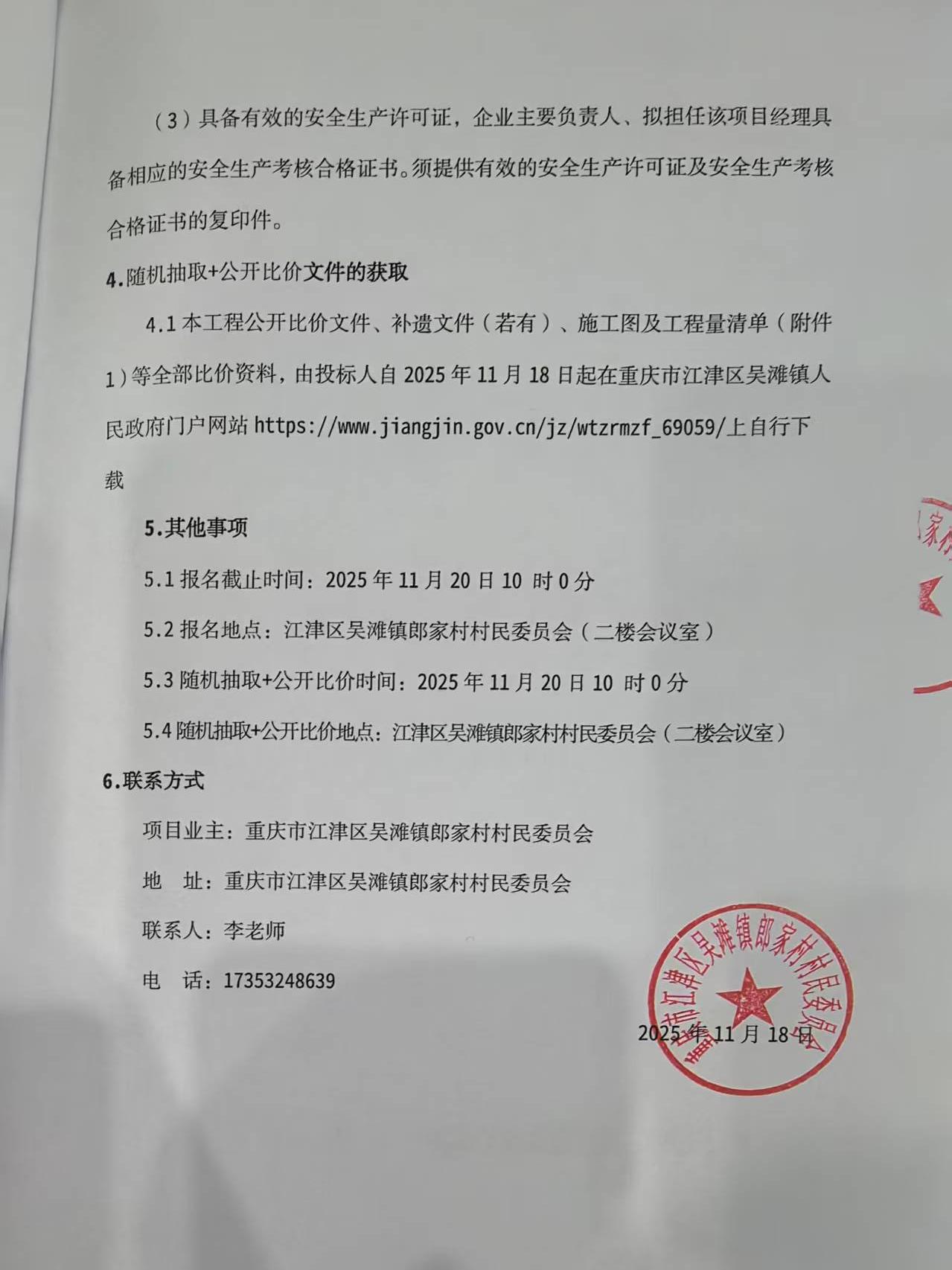 5.4随机抽取+公开比价地点:江津区吴滩镇郎家村村民委员会(二楼会议室)