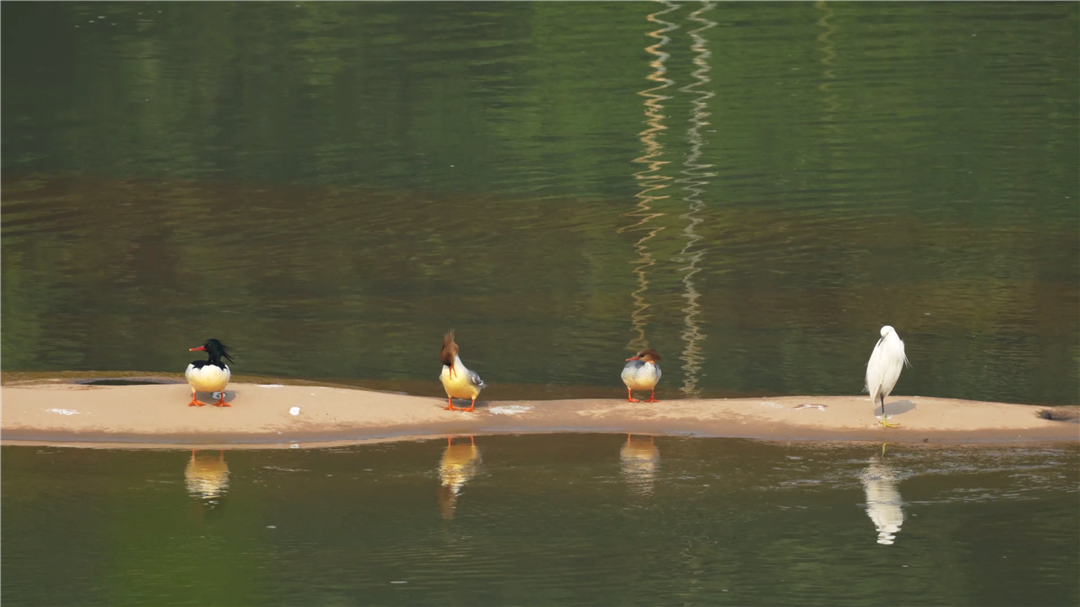 正午时分,在西湖镇綦河流域另一处日常巡护监测点,又发现3只中华秋沙鸭停歇在河滩上,时而扇动羽翼,时而在水中畅游,时而把脑袋探到水里觅食,显得悠闲自在。