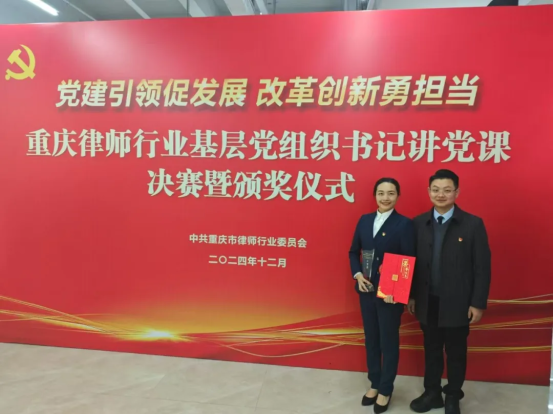 为深入学习贯彻习近平新时代中国特色社会主义思想和党的二十届三中全会精神,进一步提高基层党建工作质量和水平,推进“红岩先锋”变革型组织建设,鼓励基层党组织书记发挥好先锋模范作用,2024年12月14日,“党建引领促发展 改革创新勇担当”重庆律师行业基层党组织书记讲党课决赛及颁奖仪式在重庆律师协会一楼发布厅举行。经区县初审推选、片区选拔赛等环节层层筛选,最终有十名基层党支部书记脱颖而出,晋级决赛。其中,江津区律师行业党委推选的中共重庆津舟律师事务所党支部书记刁翠婷凭借其真挚出色的宣讲荣获二等奖。