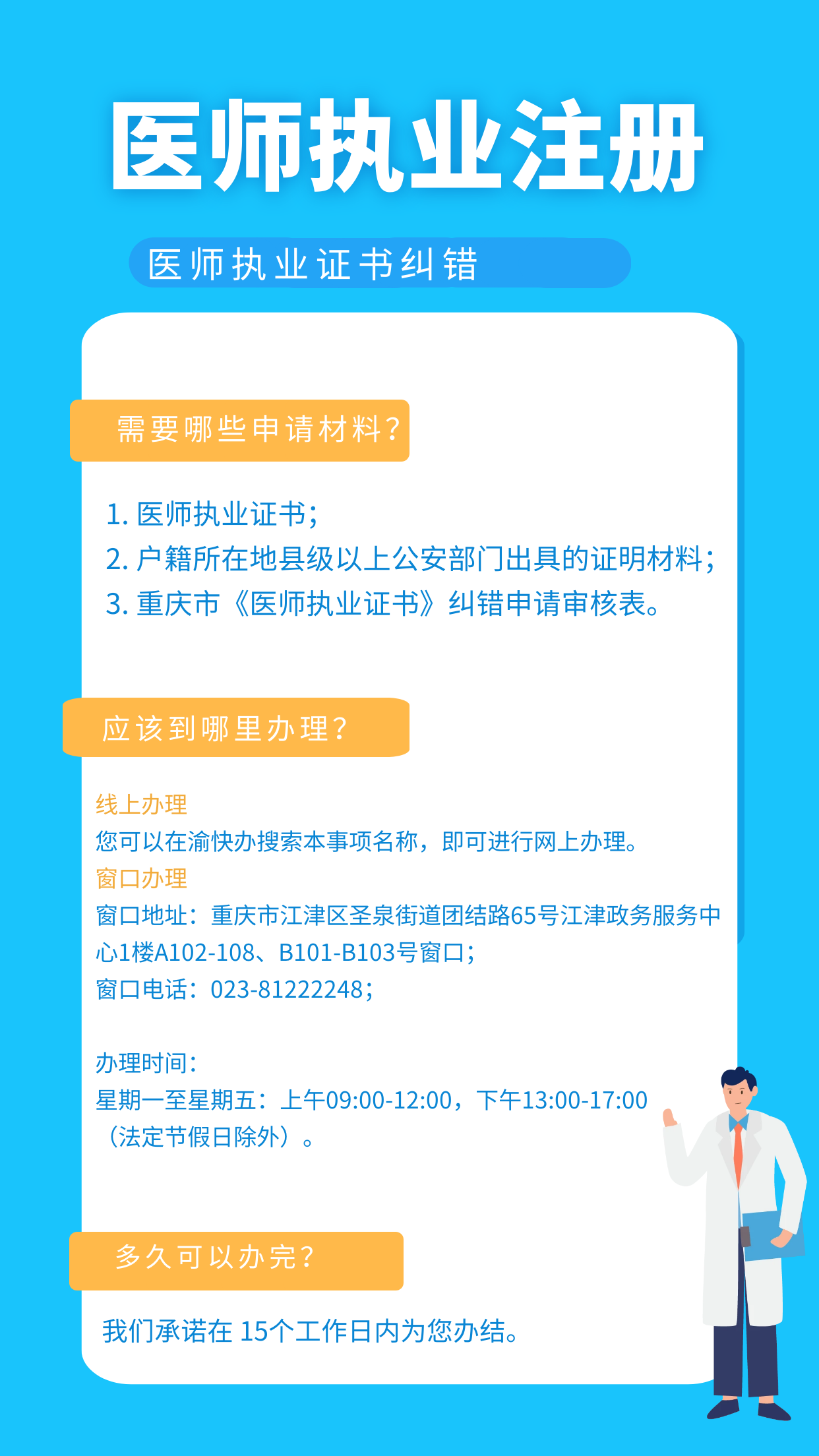 办事指南名称:医师执业注册(含外国医师来华短期行医许可,台湾地区医师在大陆短期行医许可,香港、澳门特别行政区医师在内地短期行医许可)(医师执业证书纠错)