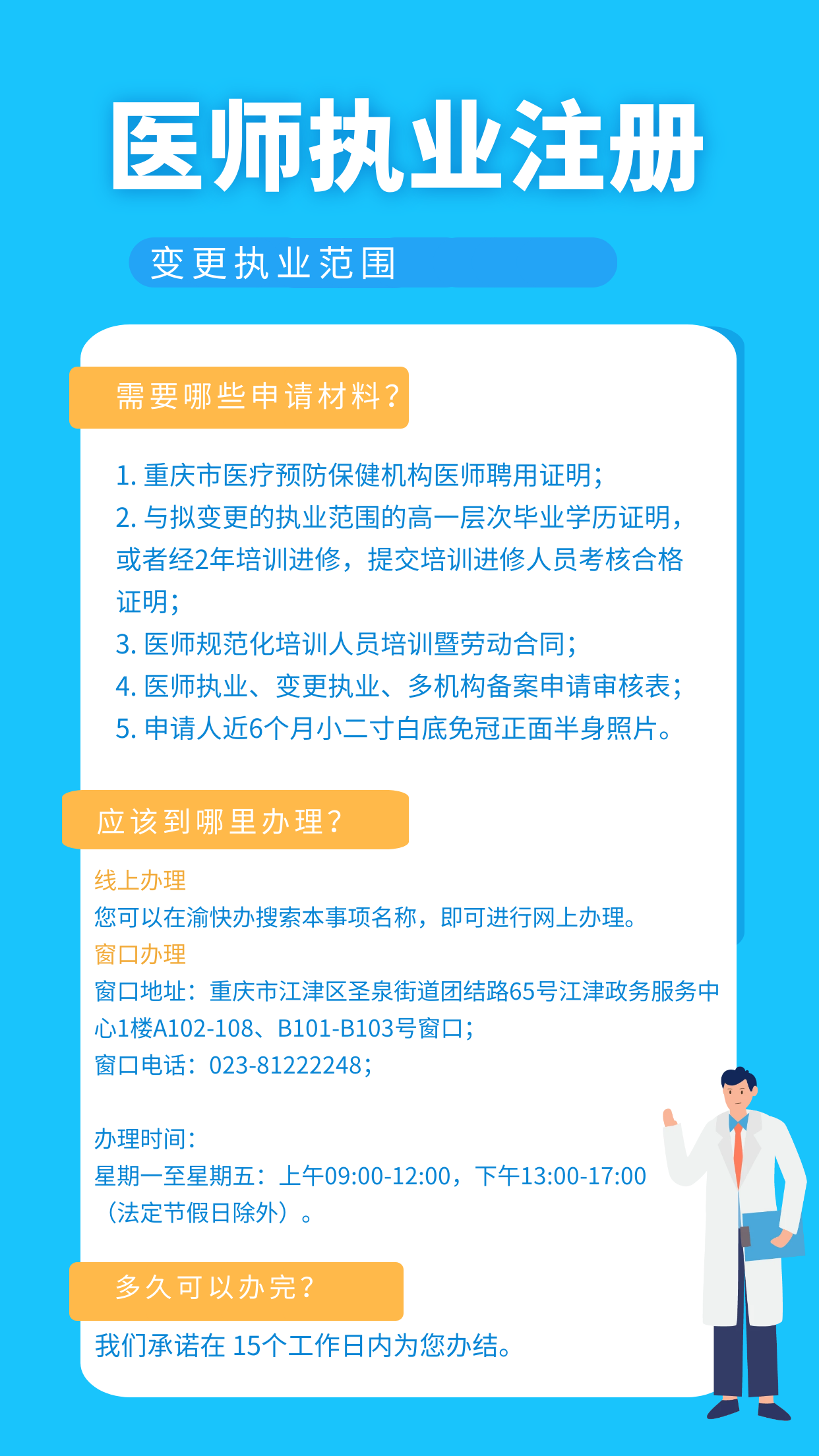 办事指南名称:医师执业注册(含外国医师来华短期行医许可,台湾地区医师在大陆短期行医许可,香港、澳门特别行政区医师在内地短期行医许可)(变更执业范围)