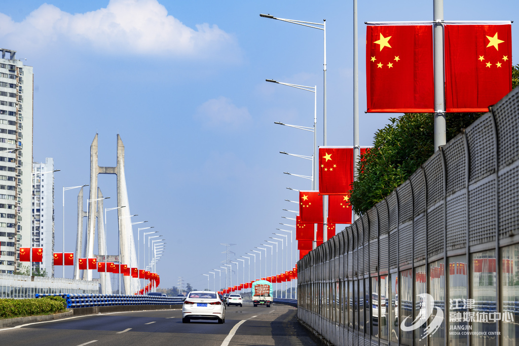 随着国庆临近,江津城区主要道路、长江大桥等重要节点悬挂起鲜艳的五星红旗。在川流不息的车流中,这一抹“中国红”显得格外明艳动人,提前营造出浓浓的节日氛围。记者看到,市民经过,情不自禁抬头仰望,有的还驻足拍照留念。