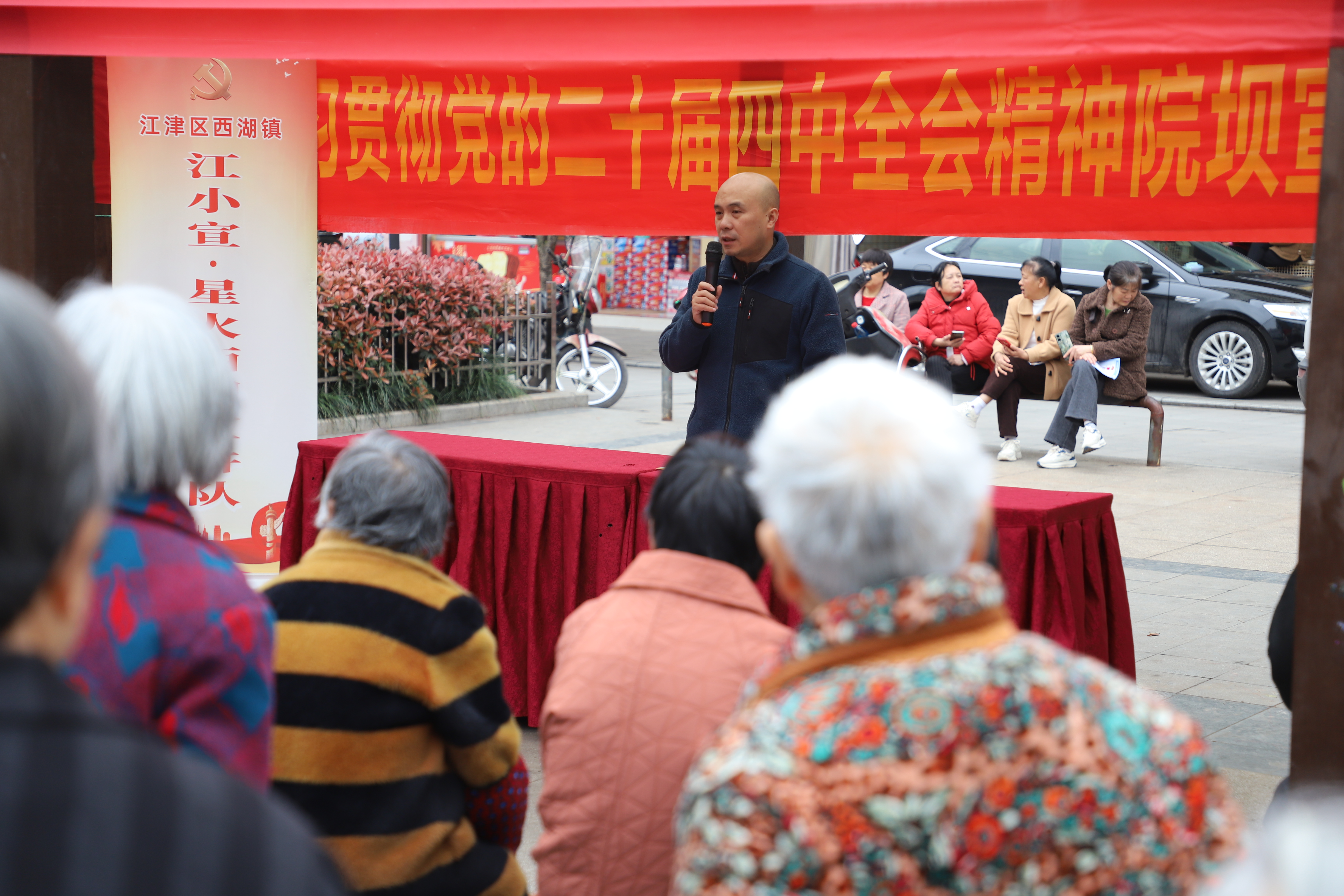 (通讯员 郑佳欣)为推动党的二十届四中全会精神在基层落地生根、入脑入心,3月17日,西湖镇“江小宣▪星火西湖”宣讲队走进河坝社区广场文化长廊,开展院坝宣讲活动,200余名居民齐聚一堂,现场学习氛围热烈。