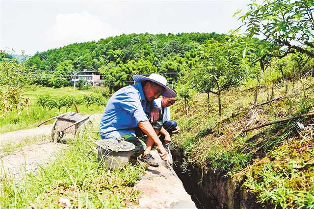 7月19日,工人正在对洞塘村污水处理站排水沟进行加固整修。通讯员 邓浩 摄