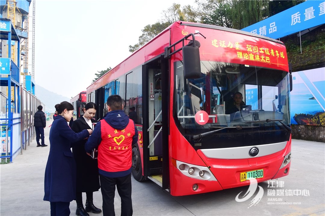 仪式结束后,与会人员共同乘坐“建证力量 强国工程青年说”学习党的二十届三中全会精神沉浸式青年理论宣讲大巴车,开启首次路线观摩。路线由车中全程宣讲+点位宣讲组成,由项目参建员工、青年宣讲员围绕深入学习党的二十届三中全会精神,讲述强国工程的建设故事,生动展现青年建筑者朝气蓬勃、勇担重任的生动群像。