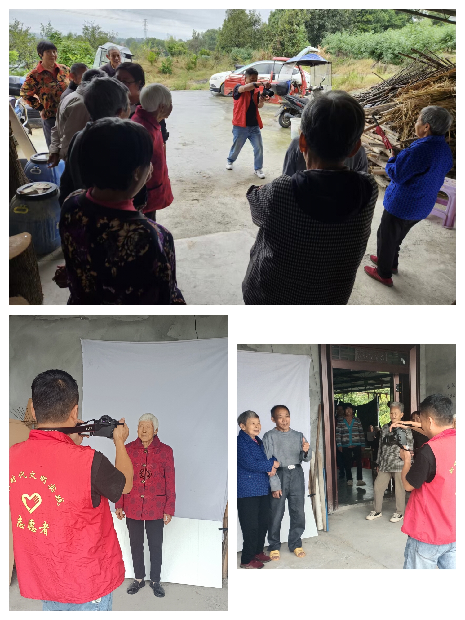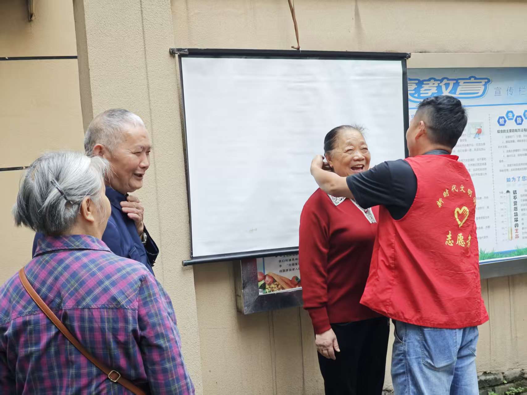 活动当天,志愿者们早早来到现场布置:将背景布仔细抻平悬挂,反复调试补光灯确保光线柔和,还特意备好木梳、格纹围巾、红色胸花等道具。“您要是觉得衣服颜色素,咱们可以搭条围巾,拍出来更显气色。”志愿者一边给居民介绍道具,一边帮老人梳理头发,现场氛围格外热闹。